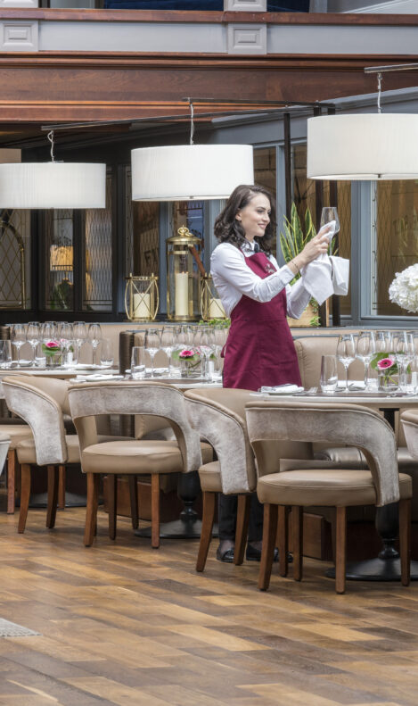 Elegant restaurant setting with a waitress arranging glassware, warm and inviting atmosphere.