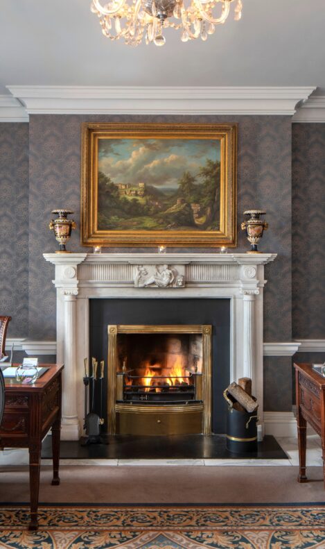 Elegant hotel lounge with a warm fireplace, classic decor, and comfortable seating.